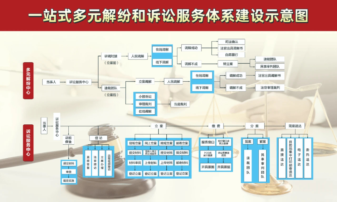 线下,入驻的人民调解组织和特邀调解员实行集中办公,纠纷统一分流,在法官的直接指导下调解案件。